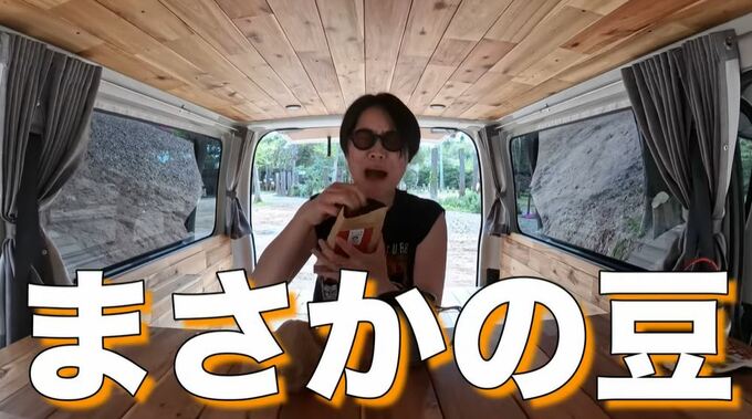 イモトさんはキャンプ料理に興じた前回に続いて、この「ハイエース」の中で "イモトの珈琲" を堪能しようと、自身でブレンドしたゲイシャの袋を取り出しますが、その瞬間数秒フリーズしてしまいます。