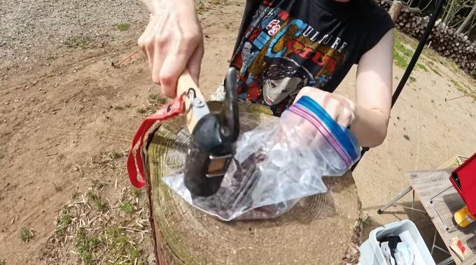 イモトさんは "粉かと思ったら、まさかの豆" と絶叫。何かと手軽にしたいキャンプなのでお湯だけ注げば仕上がるコーヒー豆を挽いた粉を持ってきたつもりが、そこにあるのは挽く前の豆。しかしイモトさんはめげずに、ジッパー付きのビニール袋にコーヒー豆を入れ、車から降りて、丸太の切り株の上にその袋を置き、ハンマーで豆を叩いて粉々にしてゆきます。