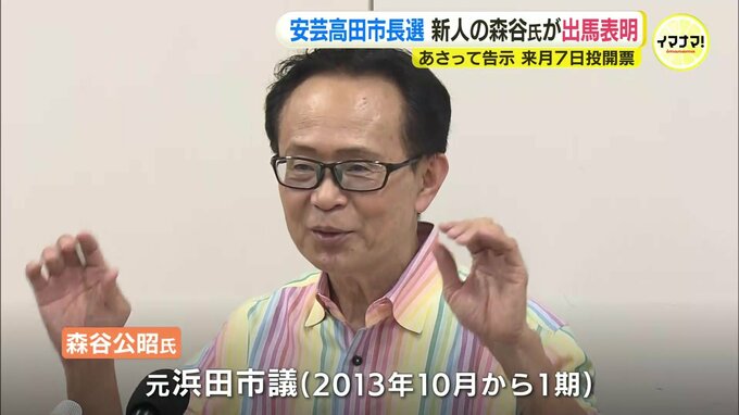 30日告示される安芸高田市長選挙に、会社経営で諸派の新人、森谷公昭氏が立候補を表明しました。安芸高田市長選に出馬表明 森谷公昭氏「財政的にいろんなことを知っているので、こうやればいいというのを市が採用…