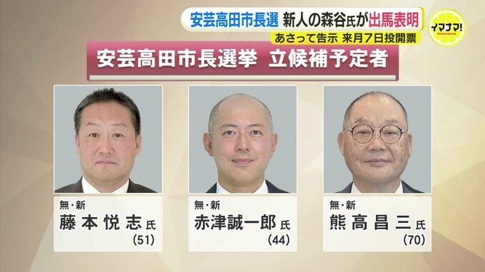 安芸高田市長選挙には、これまでにいずれも無所属新人で、▽元郵便局長の藤本悦志氏、▽会社経営の赤津誠一郎氏、▽元安芸高田市議会議員の熊高昌三氏が立候補を表明しています。
