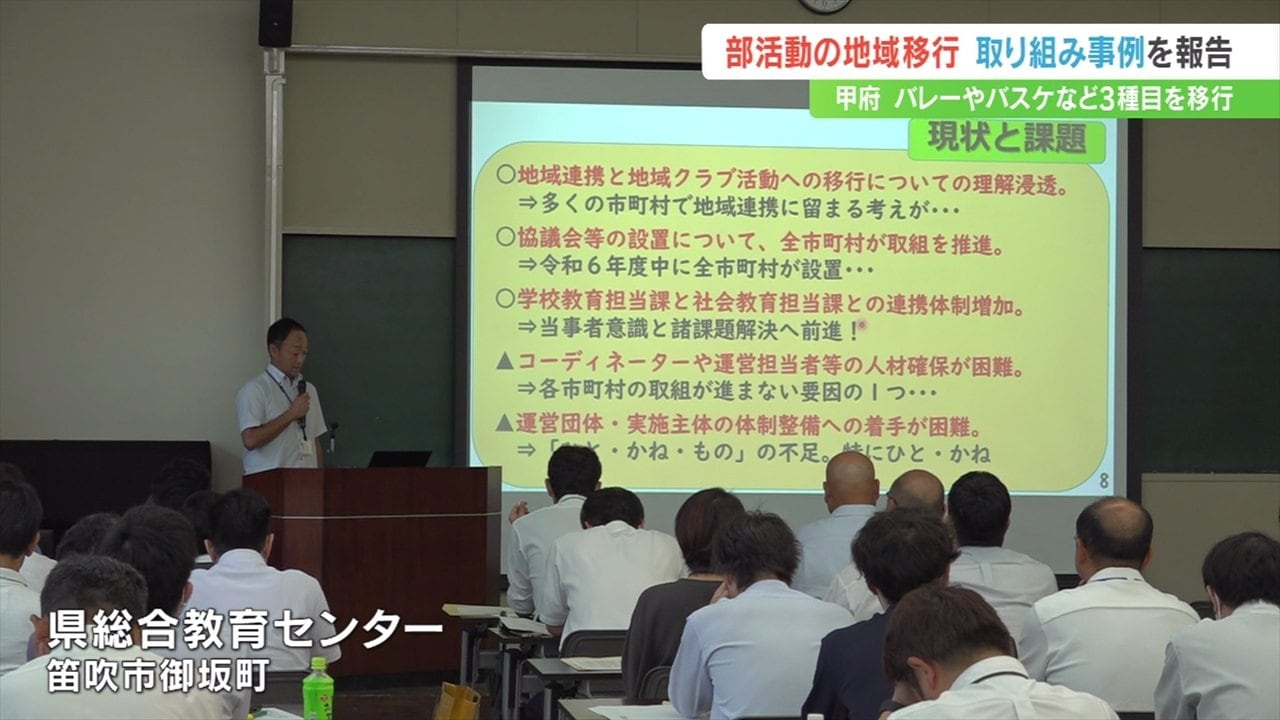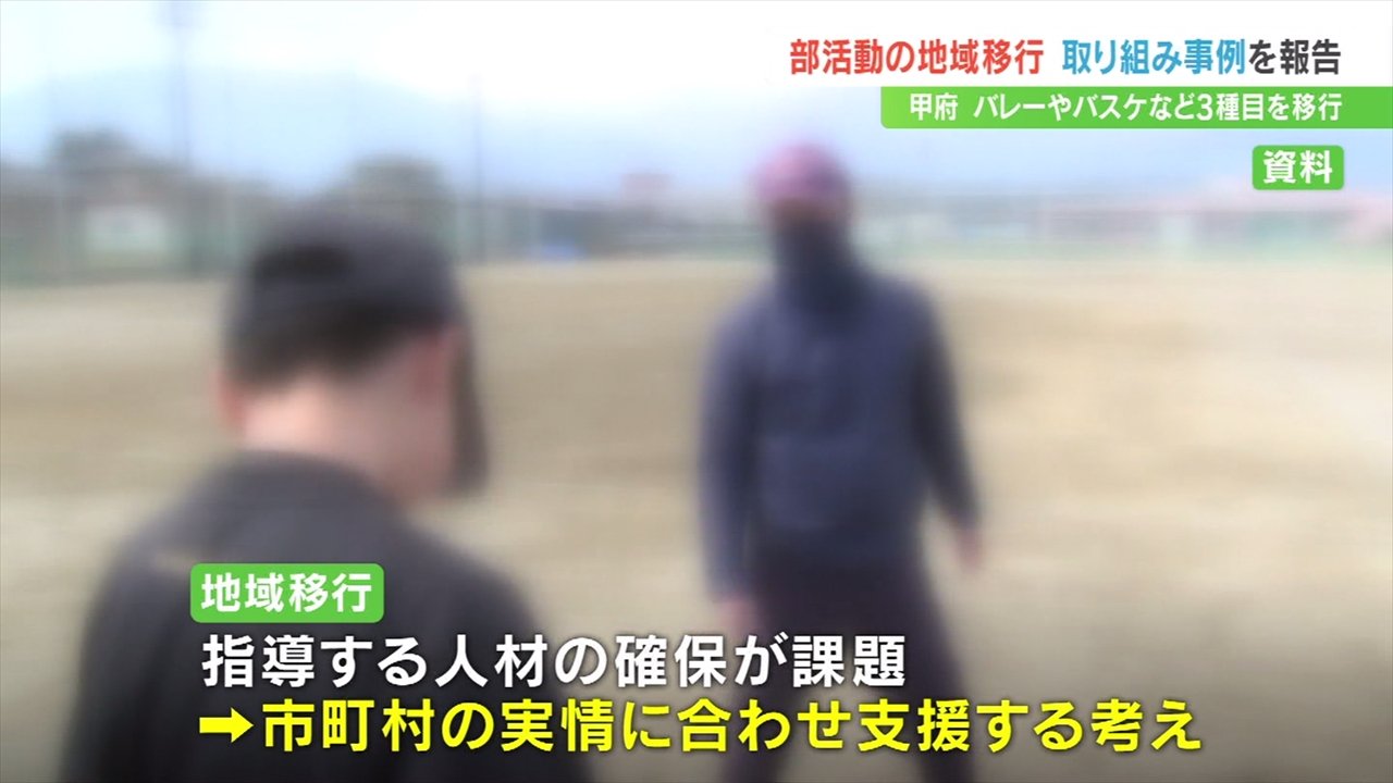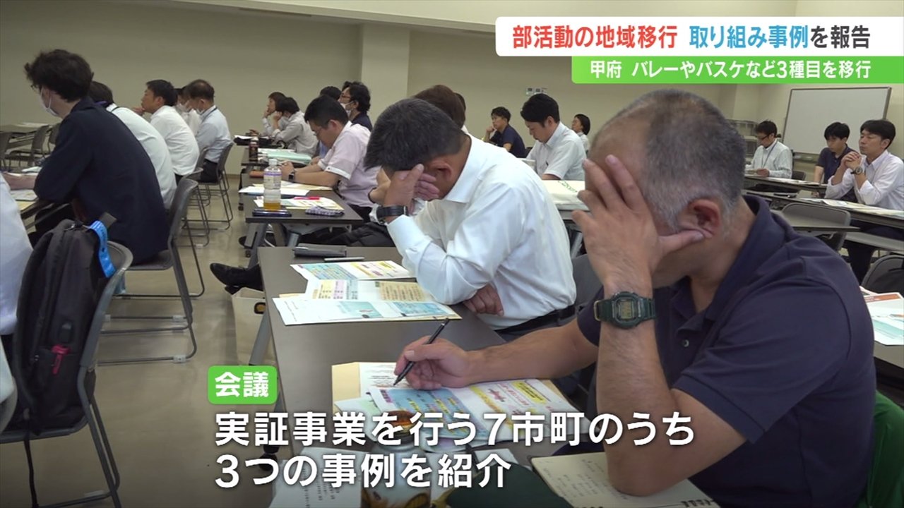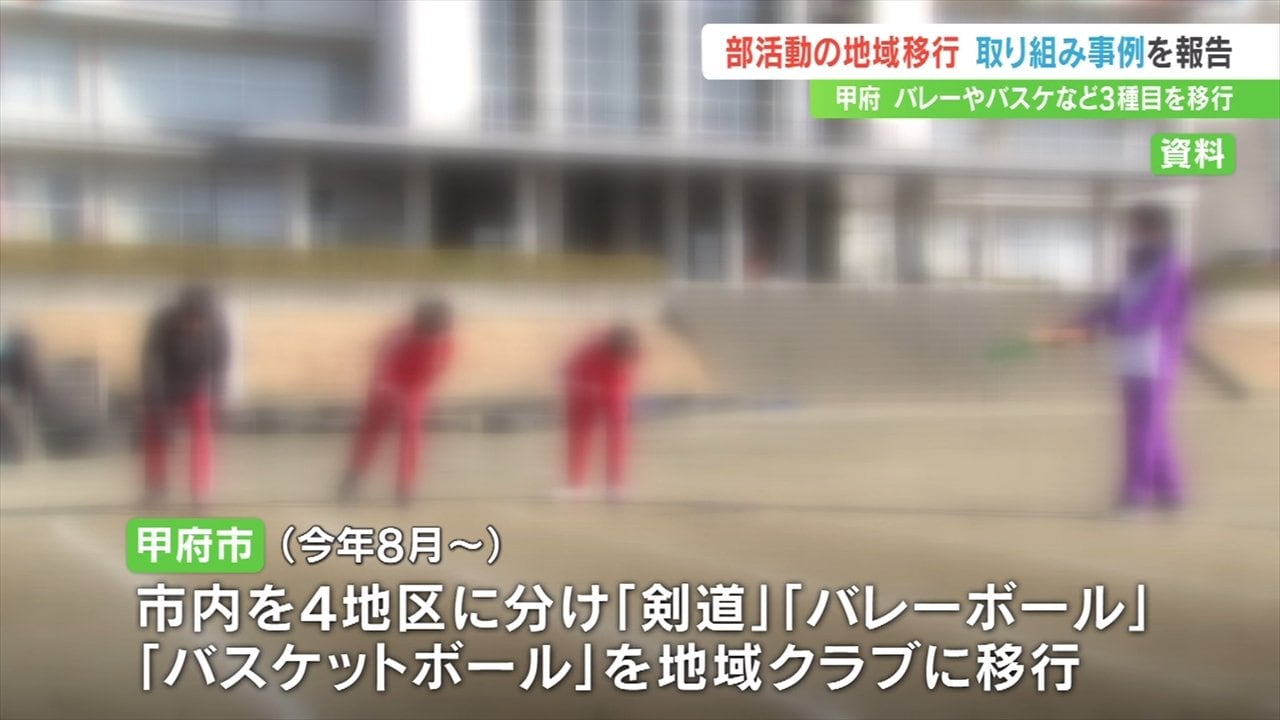 このうち甲府市は8月から4地区に分け、剣道、バレーボール、バスケットボールの3種目の部活動を「地域クラブ活動」へ移行し今後、段階的に種目を増やす予定であることを報告しました。