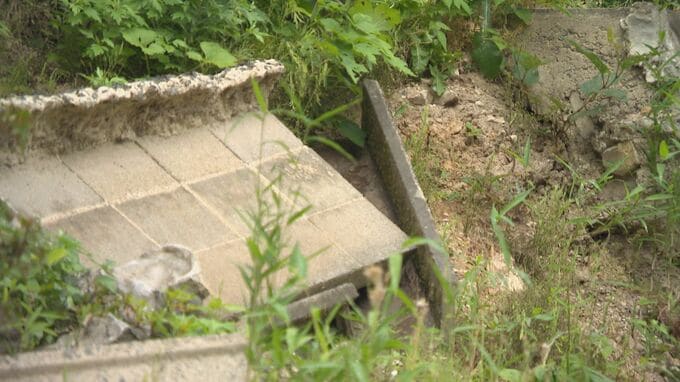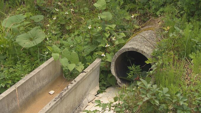 「ブロックが見えると思うが、あそこが道になっていて、そこに(田んぼの)用水が通っている。崩れてるでしょ」
