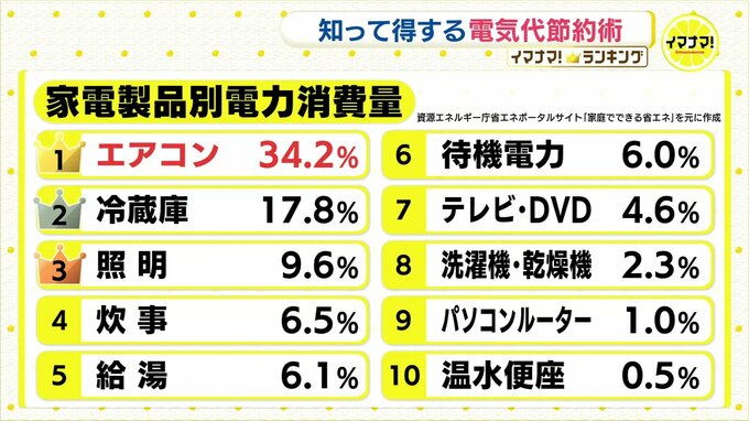 資源エネルギー庁が公表しているまとめでは、家電製品別の電力消費量はエアコンが全体の3割以上を占めて一番となっています。