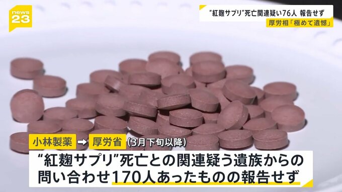 “紅麹サプリ”の問題をめぐり、死亡との関連を疑う遺族からの問い合わせが3月下旬以降、小林製薬に170人あったにも関わらず、厚労省に報告していなかったというのです。