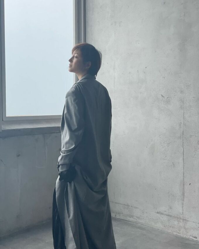 広末さんは、コンクリート打ちっ放しの室内で、大きな窓の側を向いてたたずんでおり、濃いグレーのコートをリラックスした様子で羽織っています。このところの梅雨空を思わせる仄かな光の中で、広末さんは穏やかな横顔を披露しています。