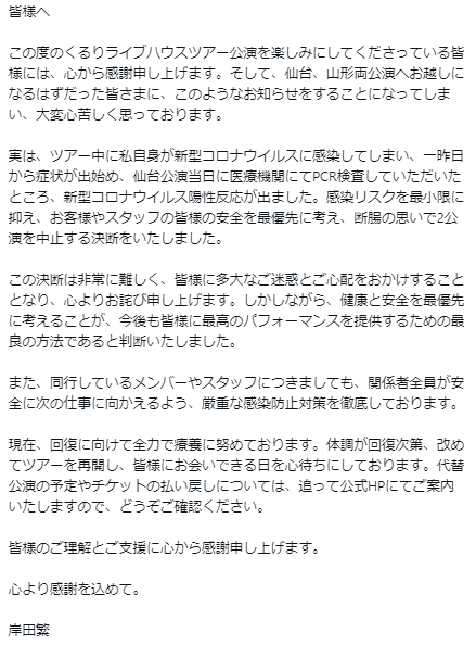 実は、ツアー中に私自身が新型コロナウイルスに感染してしまい、一昨日から症状が出始め、仙台公演当日に医療機関にてPCR検査していただいたところ、新型コロナウイルス陽性反応が出ました。感染リスクを最小限に抑え、お客様やスタッフの皆様の安全を最優先に考え、断腸の思いで2公演を中止する決断をいたしました。