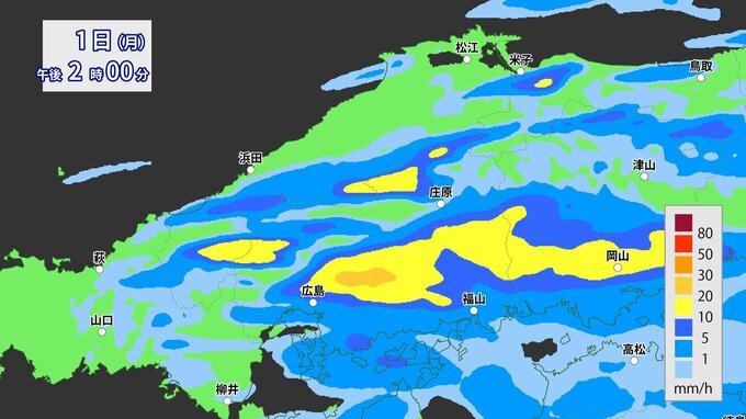 1日未明から雨の降り方が強まり、廿日市市津田で1時間52.5ミリの非常に激しい雨を観測したほか、広島空港で44.5ミリ、広島市中区で43ミリの激しい雨を観測しています。