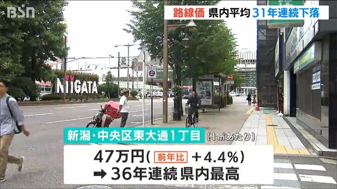 税務署別の最高路線価をみると、県内で唯一上昇したのが新潟市 中央区 東大通1丁目の「新潟駅前通り」で、1平方メートルあたりの価格は去年と比べて2万円上がり、47万円に。