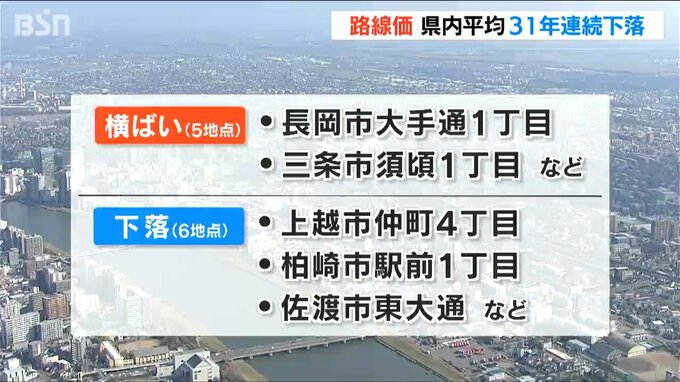 このほか長岡市や三条市、新発田市など5つの地点は横ばいで、上越市や柏崎市、佐渡市など6つの地点で下落しました。