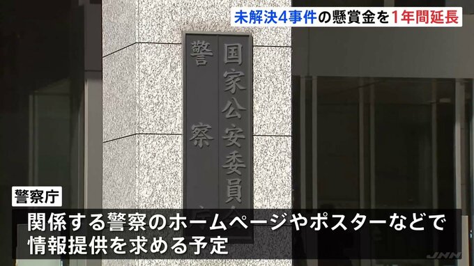 警察庁は、1995年に東京・八王子市のスーパーで女子高校生ら3人が射殺された強盗殺人事件など未解決の4つの事件について、捜査特別報奨金の受付期間を1年間延長することを決めました。捜査特別報奨金は、警察庁が…