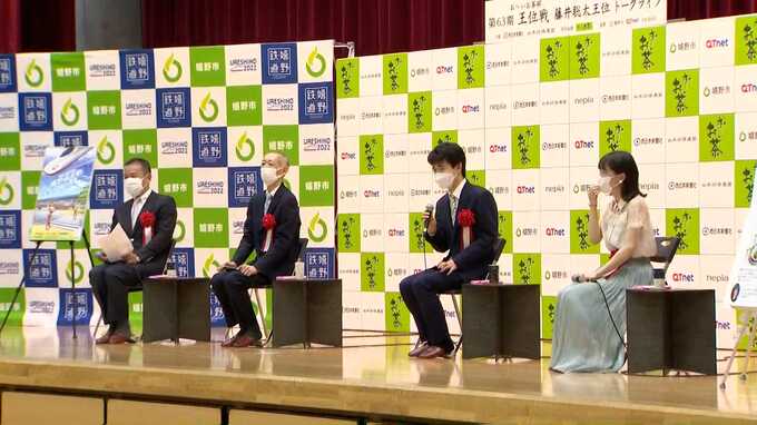 佐賀県嬉野市で開かれた藤井聡太五冠のトークショー。ステージ上には藤井五冠のほかに、福岡市出身の中田功八段や豊川孝弘七段、それに佐賀県出身の武富礼衣初段がのぼりました。藤井五冠は15日から、王位戦七番勝負の第4局に挑むはずでしたが、相手の棋士が新型コロナウイルスに感染したため、対局は延期に。この会場で予定されていた大盤解説会の代わりに、トークイベントが企画されたものです。