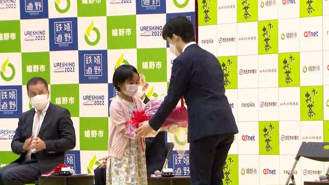 王位戦の対局は、2021年も嬉野市で開催予定でしたが、記録的豪雨のために延期されていて、実際の対局を見るのはまた次の機会となりました。最後に地元の子供たちから花束と記念品を受け取り、ステージをあとにした藤井五冠。延期された王位戦第4局は、今月24日と25日に徳島市で行われます。