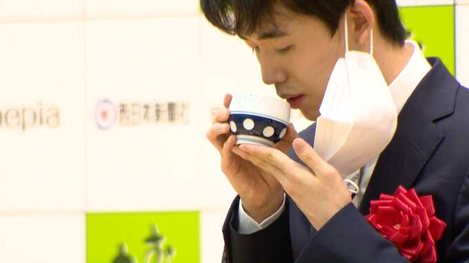 藤井聡太五冠「ふふふ、梅酒です。(初めての味はどうでしたか?)うん、えーと(会場笑)梅酒は飲みやすくて、おいしかったです」