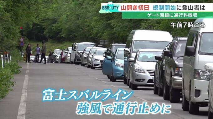 5合目に通じる富士スバルラインは強風で通行止めに。