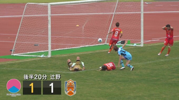 ふじざくらは後半開始から攻撃的な選手を投入し、後半20分、山本のパスに抜け出した辻野がキーパーの股を抜く技ありシュートで同点に追いつきます。