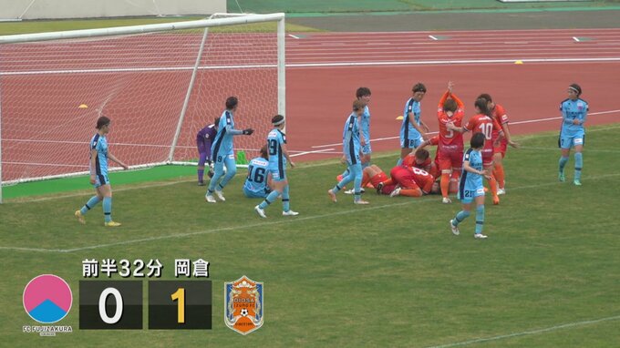 ここまでリーグ戦3位のふじざくらは前半32分、出雲にコーナーキックからヘディングで押し込まれ、1点ビハインドで折り返します。