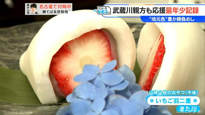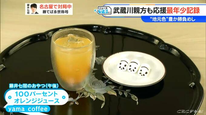 午後のおやつは、藤井七冠はyama coffeeの「100パーセントオレンジジュース」のみ、すべてのドリンクにパンダのマシュマロがついています。山崎八段は北区にある老舗和菓子店 きた川の「いちご羽二重」でした。