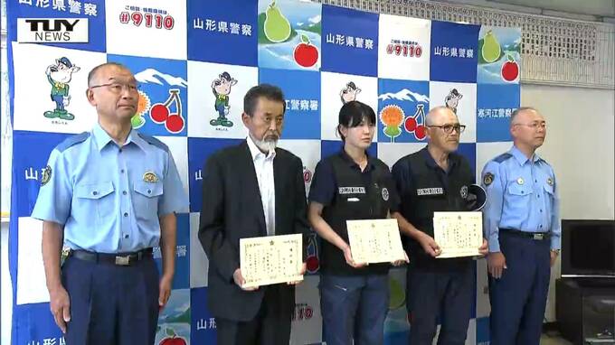 寒河江警察署できょう、犯人の追跡や行方不明者の捜索活動に協力する、嘱託警察犬の指導手に嘱託書が手渡されました。交付式に参加したのは、今年で6回目の伊藤繁則さんと、娘のレイニング享さん。そして、鈴木武…