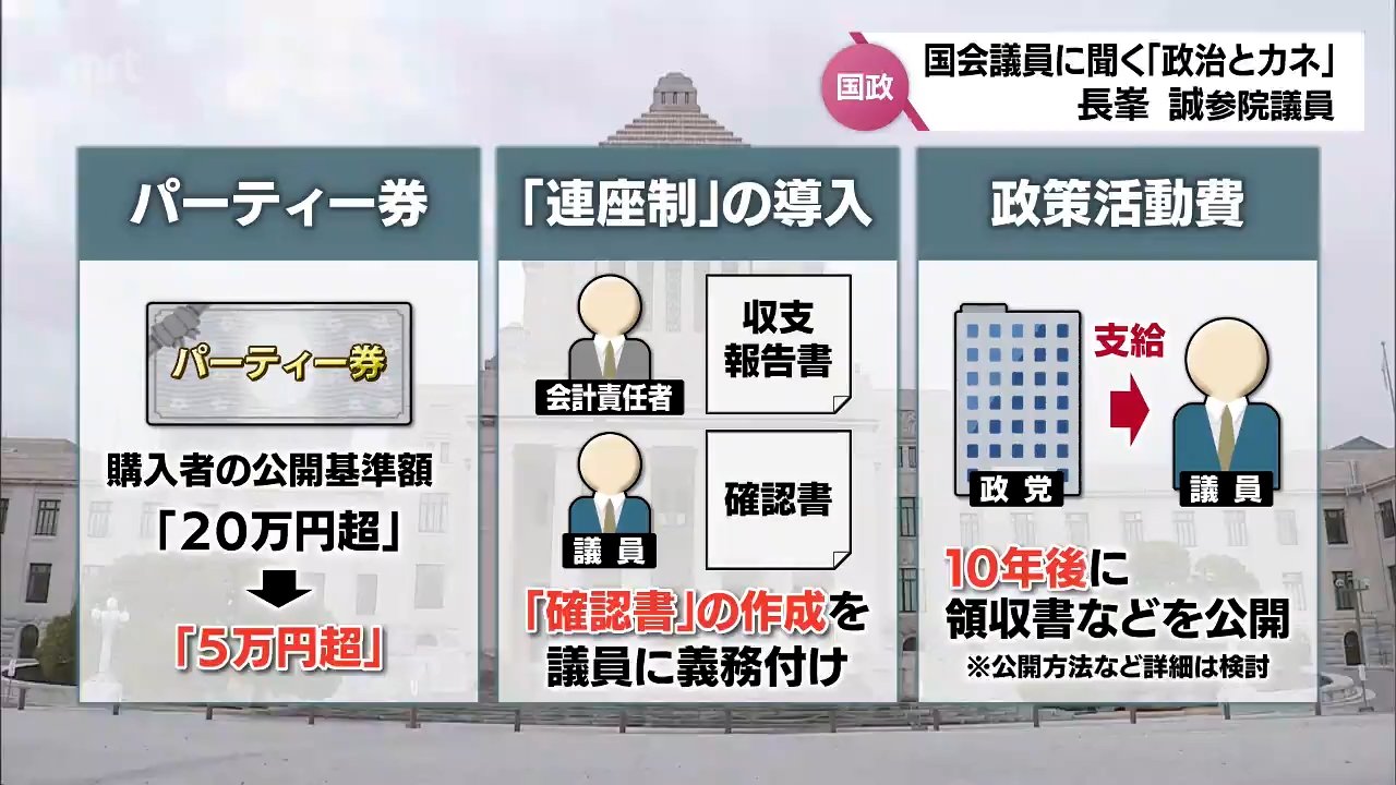 パーティー券を買った人の公開基準額を今の「20万円超」から「5万円超」に引き下げるほか、議員本人に対する罰則を強化するいわゆる「連座制」導入のため収支報告書の「確認書」の作成を議員に義務づけるとしています。
