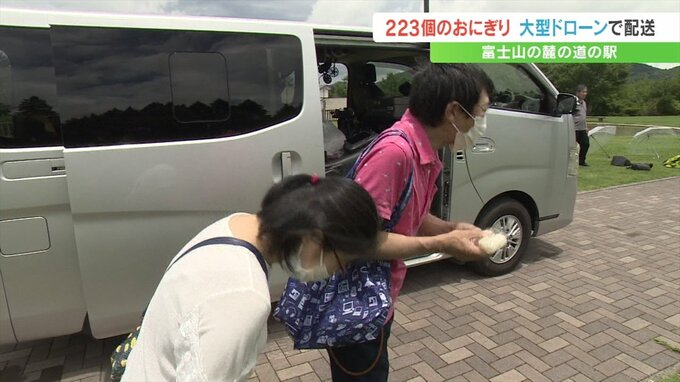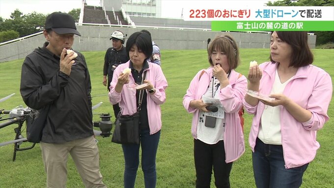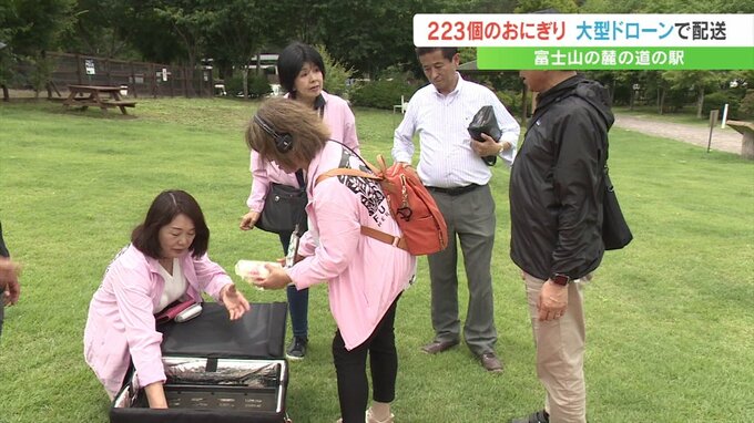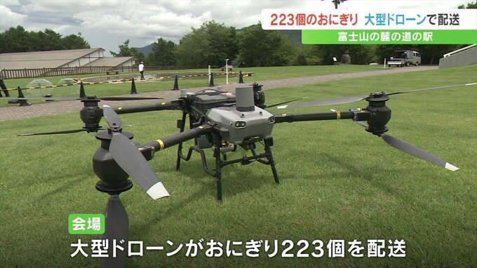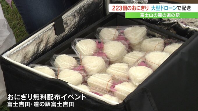 富士山の麓の道の駅では7月1日の開山を祝って223個のおむすびを大型のドローンで配送して無料で配るイベントが行われました。
