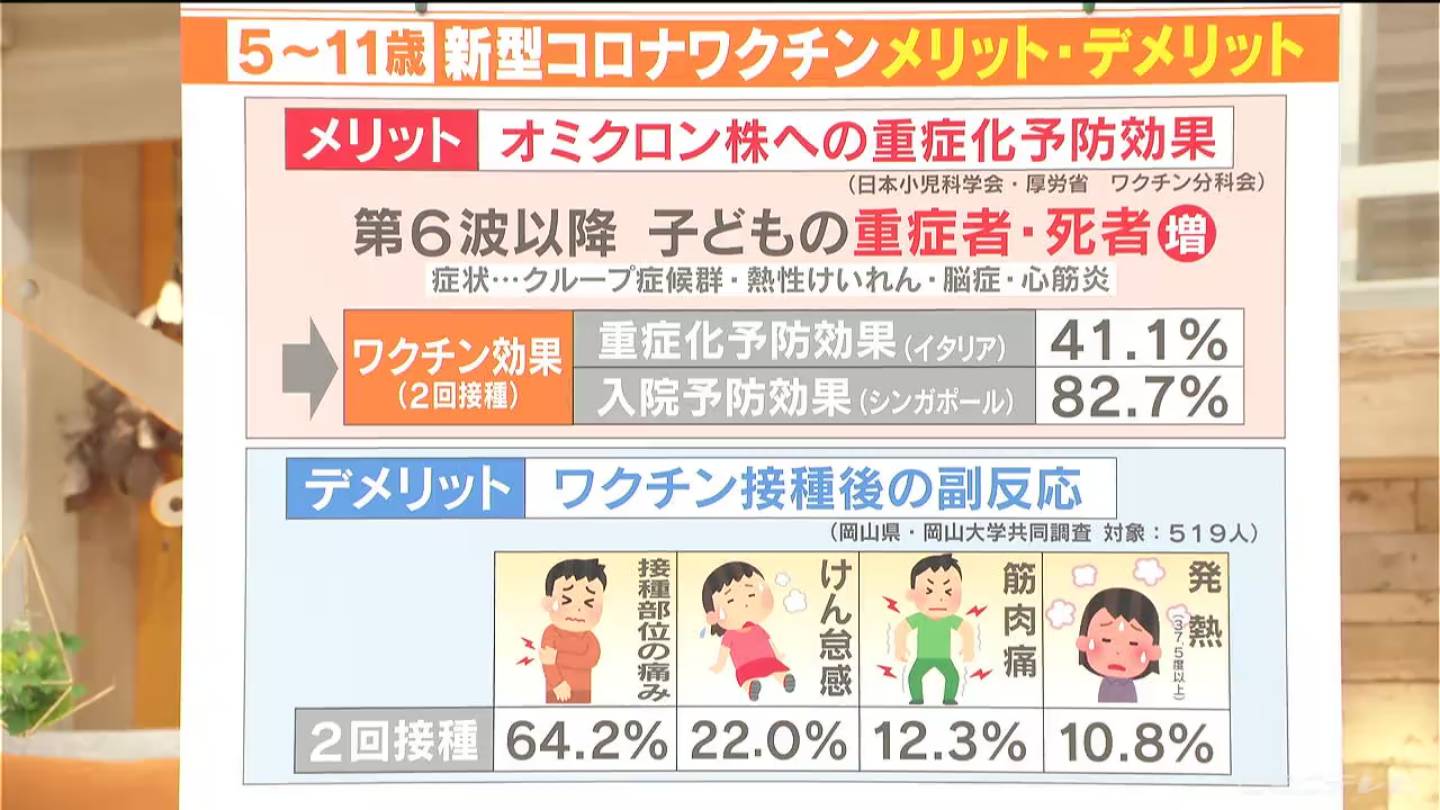 岡山県などがまとめたデータでは、5歳から11歳の子どもの2回目のワクチン接種後の副反応として、接種部位の痛みが64%となったほか、倦怠感、筋肉痛発熱などが報告されています。