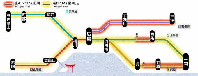 【交通情報】JR山陽線 西条~瀬野駅間 上り線で運転見合わせ 倒木による影響 JR西日本 中国放送 2024年7月1日(月) 18:59 国内 JR西日本によりますと、JR山陽線は八本松駅~瀬野駅間の上り線で、木が倒れているため、西条~瀬野駅間の上り線で運転を見合わせています。なお、運転再開は19時30分以降となる見込みです。
