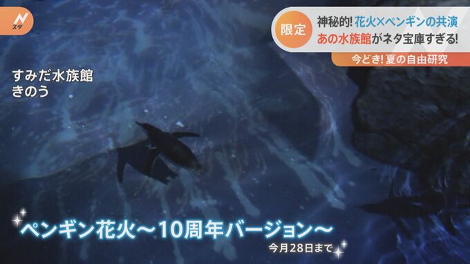 ペンギンプールをプロジェクションマッピングの花火が彩る幻想的なショー。すみだ水族館で期間限定です(28日まで)。