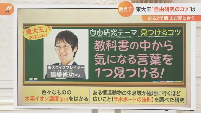 『東大王』でおなじみ、クイズプレーヤーの鶴崎修功さんです。鶴崎さんによりますと、「教科書の中から気になる言葉を1つ見つけて、それをきっかけに自由研究をやってみたらどうか」ということです。
