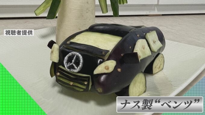 ナス製の“ベンツ”。ナス本来のツヤを生かし、高級感を演出しています。
