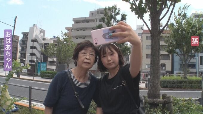 神奈川からスカイツリーに遊びに来たご家族。お孫さんはおばあちゃんと写真を撮るとき、いつも加工しているんだそう。
