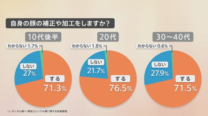 10代が楽しむように思える写真加工アプリですが、マンダムの調査では20代はもちろん、30代から40代のおよそ7割が使っているという結果に。