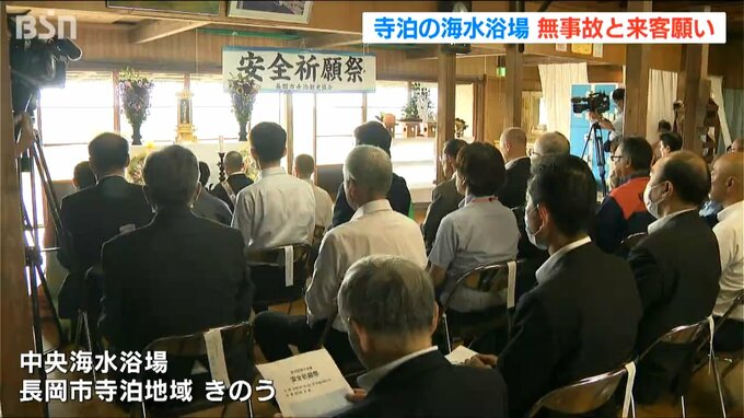 安全祈願祭を行ったのは、長岡市寺泊地域の4つの海水浴場の関係者です。海開きを前に、シーズン中の無事故と多くの来客を願いました。