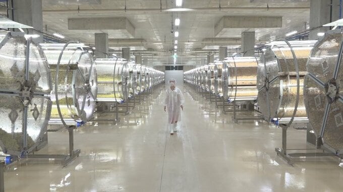 「ご覧ください。宇宙船の中のような近未来の工場です。たくさんの装置の中で作られているのがブロッコリースーパースプラウトです」
