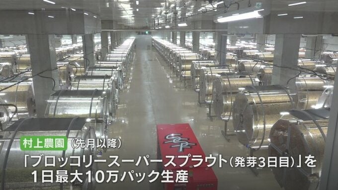 村上農園は6月から工場をフル稼働させ、発芽3日目のブロッコリーの新芽ブロッコリースーパースプラウトを1日最大10万パック生産し東日本に出荷しています。