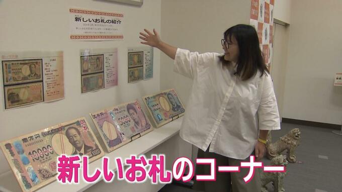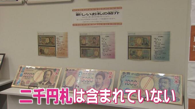 ▽比嘉リポーター 「日本銀行那覇支店の展示コーナーにやってきました。新しいお札の紹介コーナーには新一万円、五千円、千円と展示されていますけど…残念ながら、今回、二千円札は含まれていないんです」