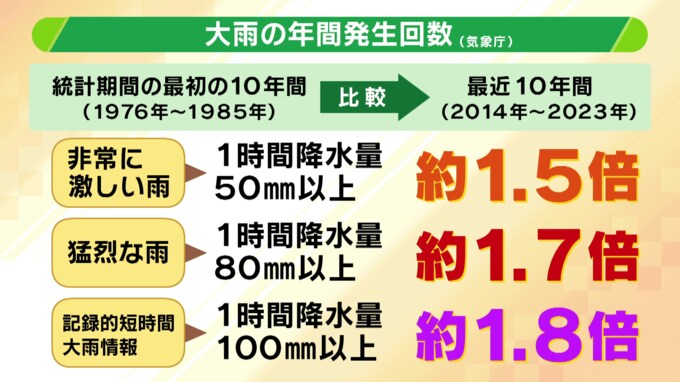 雨に関しては、統計期間の最初の10年間と、最近10年間を比較すると、明らかに違いが出ています。非常に激しい雨(1時間50ミリ以上)は1.5倍。猛烈な雨(1時間80ミリ以上)は1.7倍。記録的短時間大雨情報(1時間100ミリ以上)は1.8倍と増えています。こうした雨の増加が、土中の水圧にも関わり、土砂災害が増えているとみられます。