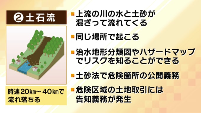 続いての災害は『土石流』。時速20~40キロほどで、上流から川の水と土砂が混ざって流れてくる災害です。こちらも何度も同じ場所で起きる特徴があります。逆に言うと、治水地形分類図や、ハザードマップで前もってリスクを知ることができます。