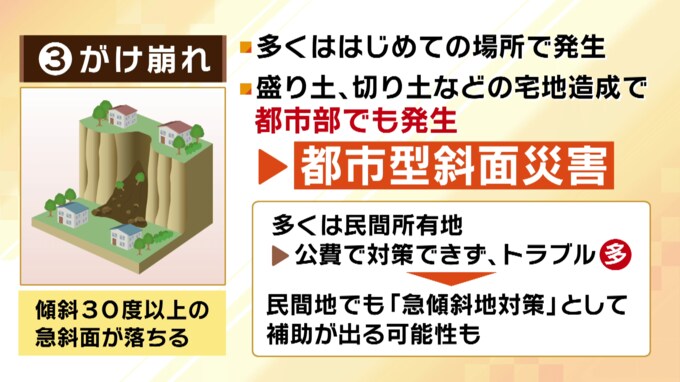 都市型斜面災害は、民間の土地で起きることが多く、トラブルとなる場合もあります。ただ、民間の土地であっても急傾斜地対策として公の補助が出る可能性もあるということです。