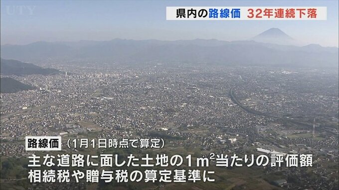 相続税など土地の課税の基準となる「路線価」が公表され3200地点余りを対象にした山梨県内の平均価格は32年連続で下落しました。