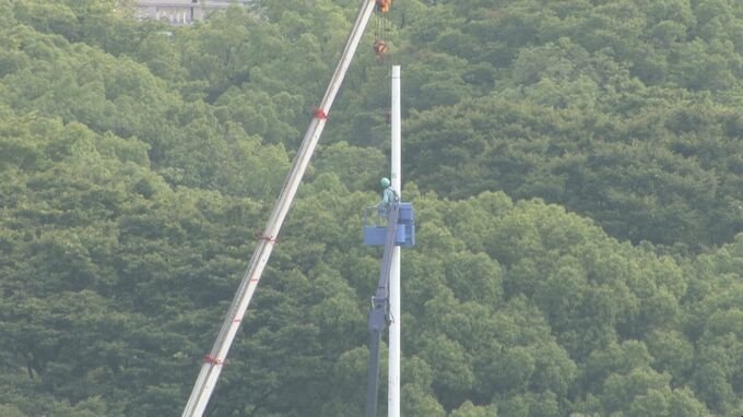 今後、土台部分も撤去して、同じ場所に基礎部分を新設して新たなポールを設置します。隣りに設置していた高さ10メートルの仮設ポールは取り外します。