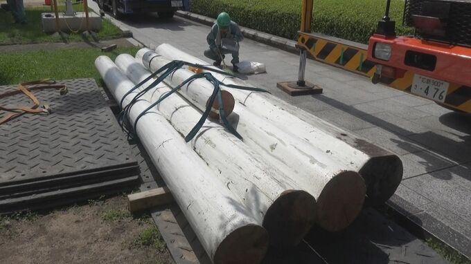 去年11月、広島市の平和公園で、国旗を掲げるポールが強風で折れました。この折れたポールを撤去する作業が3日、始まりました。