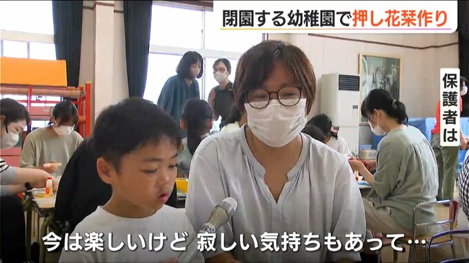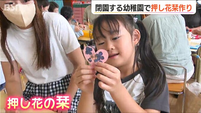 全園児11人が真剣な表情で取り組んでいた押し花を使った栞づくりは、53年の歴史を終える幼稚園での思い出を形に残そうと、保護者が企画したものです。