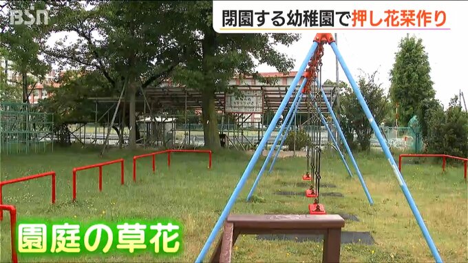 今年度いっぱいで閉園する新潟県立幼稚園(新潟市東区)で、子どもたちが園庭で摘み取った草花を使った栞づくりに挑戦しました。