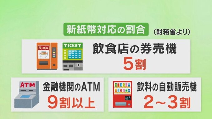 財務省のまとめでは新紙幣対応の割合は金融機関のATMで9割ですが、飲食店は5割、飲料の自動販売機は2割から3割にとどまっています。
