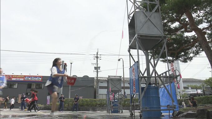 最高気温が32.3度になった岐阜県高山市。皆さん、バケツの水を力強く放っていきます。