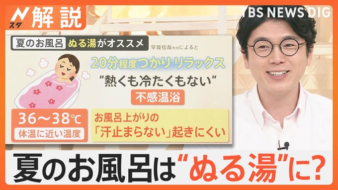 きょうも各地で猛暑日を記録する厳しい暑さの1日となりましたが、みなさんそんな日は、お風呂、どうしていますか?良原安美キャスター:温泉療法専門医の東京都市大学・早坂信哉教授によると「夏こそ湯船につかって…