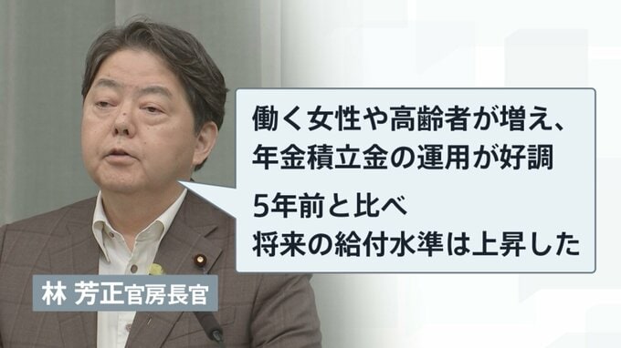 今回の検証結果について、林芳正官房長官は「働く女性や高齢者が増え、年金積立金の運用が好調。5年前と比べると、将来の給付水準は上昇した」と説明しています。