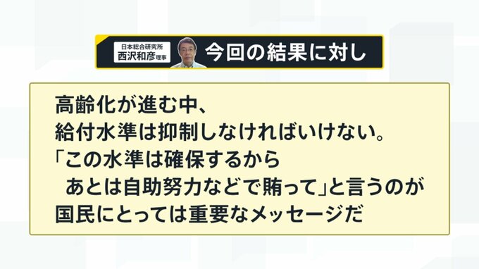 ただ、日本総合研究所の西沢和彦理事は「高齢化が進む中、給付水準は抑制しなければいけない。『この水準は確保するからあとは自助努力などで賄って』というのが国民にとっては重要なメッセージだ」と指摘をしています。