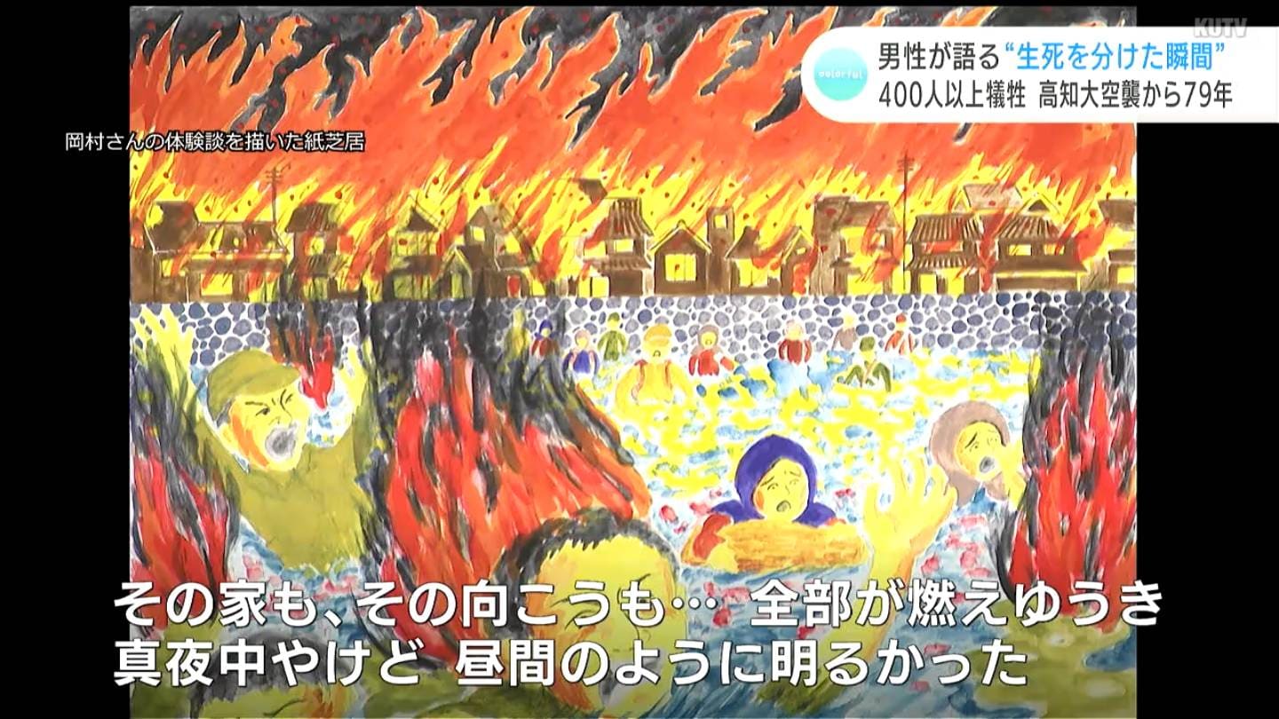 「(鏡川の)向こう岸から対岸を見たら、建っちゅう家が全部燃えゆう。その火の大きさ。その家も、その向こうも、全部が燃えゆうき。真夜中やけんど、昼間のように明るかった。そして(米軍の)飛行機が、火に照らされて黄色く見えた」