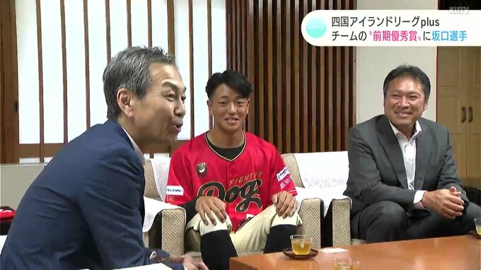 四国アイランドリーグplus前期シーズンの優秀選手に選ばれた、高知ファイティングドッグスの坂口大輔選手に表彰状が手渡されました。この表彰はリーグが創設された20年前から行われています。四国4県の知事が、前期シーズンで活躍したそれぞれの県のチームの優秀選手を表彰していて、高知ファイティングドッグスでは外野手の坂口大輔選手が選ばれました。